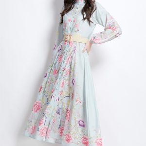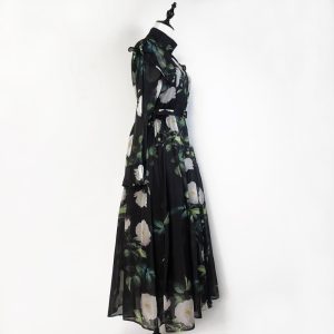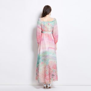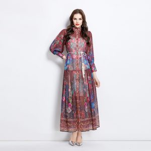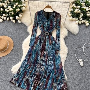 Drape bandage printing long dress pinched waist V-neck dress