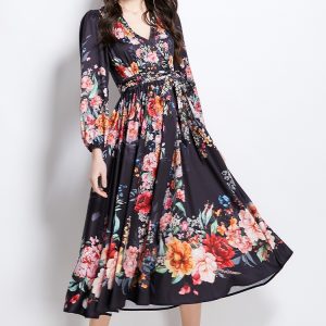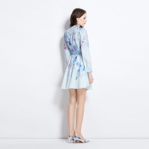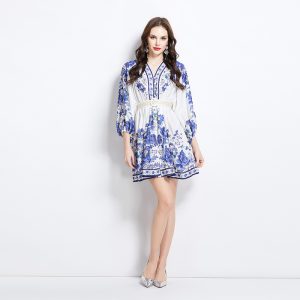 Pinched waist printing vacation big skirt lantern sleeve dress