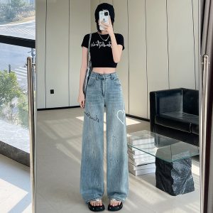 Straight loose jeans printing wide leg pants for women