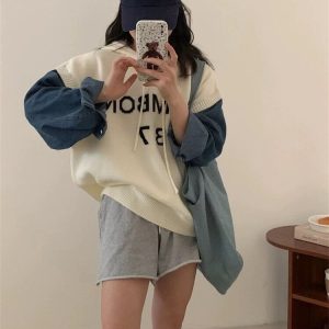 Denim sleeve jacquard splice sweater loose knitted hoodie